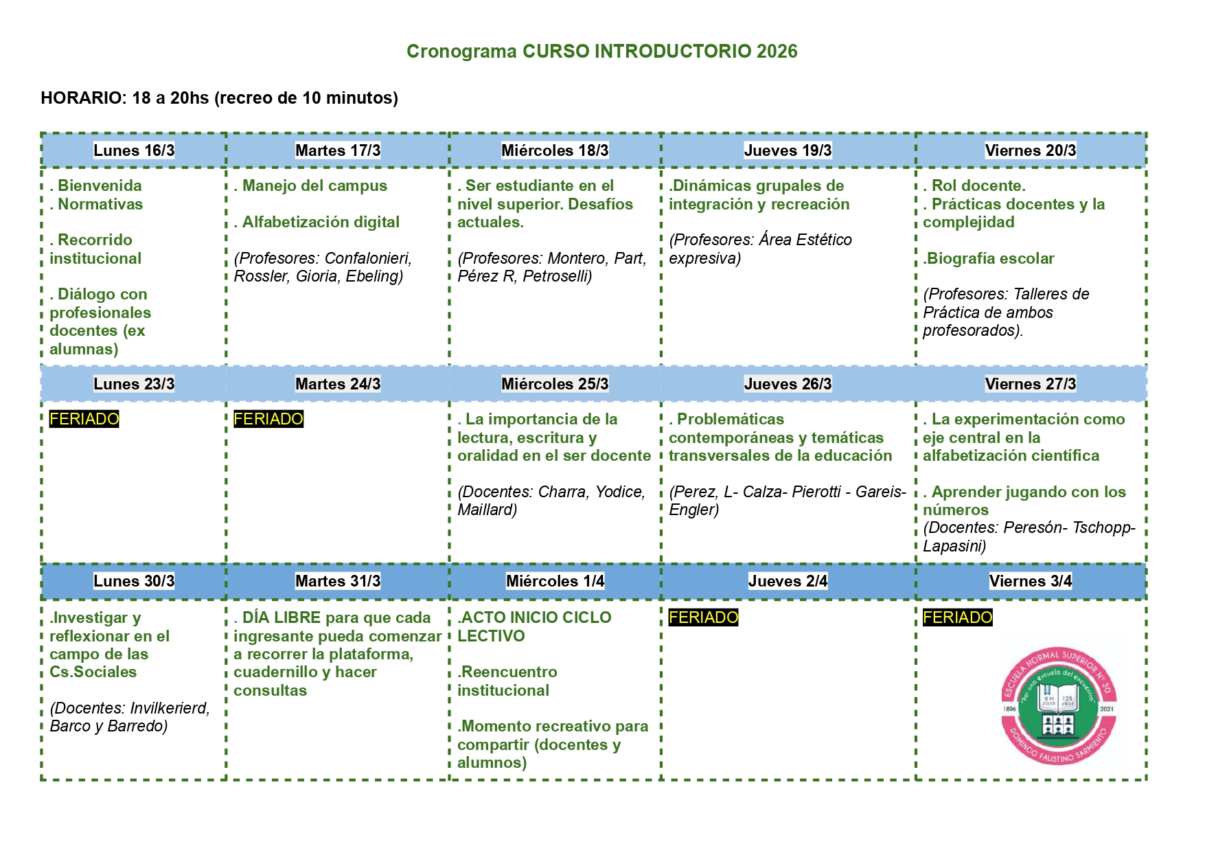 Propedéutico 2026 Cronograma 2026 Lista de Materiales para Ingresantes Manual del Ingresante Ser Estudiante en el Nivel Superior Campus Virtual-Informática- Áreas Integradas-Mov.y Cuerpo-Área Estético Expresiva-Psicología-Sujeto de la Educación Movimiento y Cuerpo/Área Estético-Expresiva Lengua y Ciencias Sociales El país de Juan-María Teresa Andruetto (Cuento) Formación en la Práctica Profesional Régimen Académico Marco